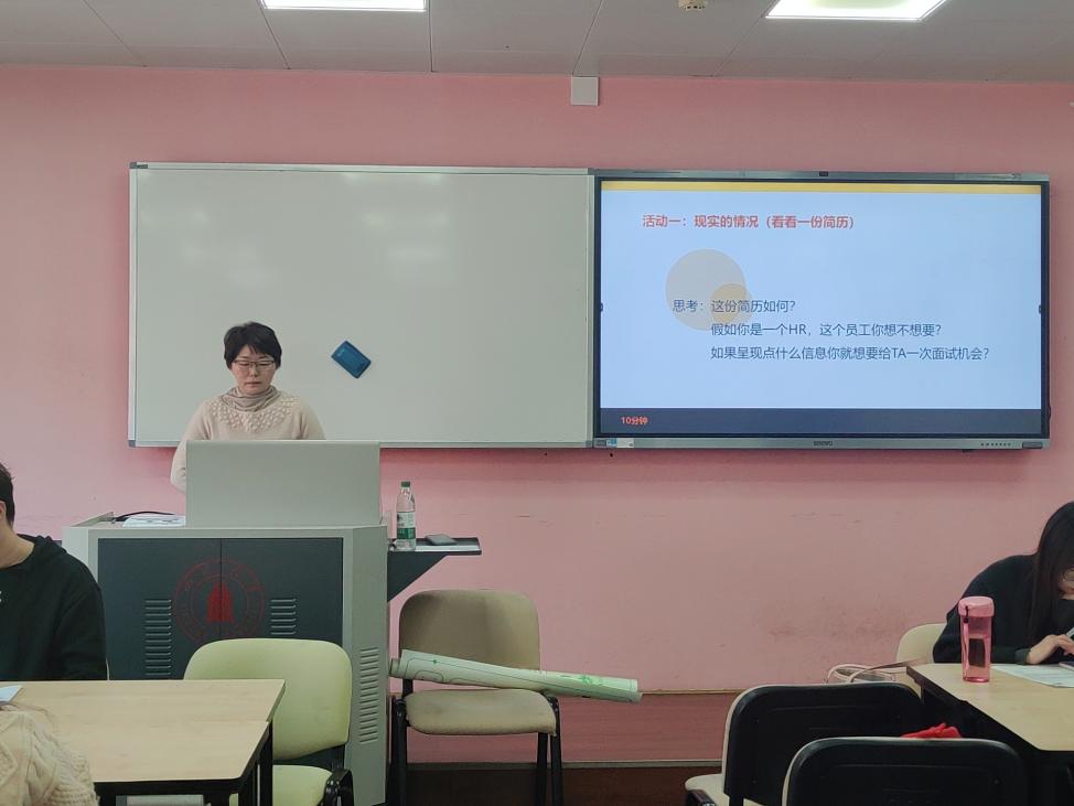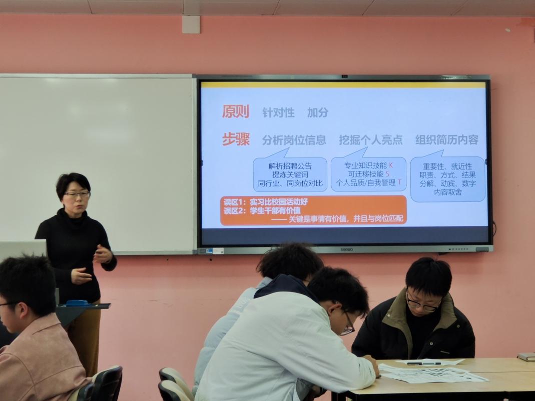 在团体辅导的互动研讨环节,何惠老师引导学生从HR视角审视简历,通过"岗位画像-能力拆解-成果对标"三步分析法开展结构化研讨。参加学生基于目标岗位胜任力模型,从雇主关注维度对简历内容实施三大优化:①运用STAR-L法则重构经历描述,强化过程数据与价值产出;②通过关键词前置策略匹配招聘系统筛选逻辑;③采用视觉锚点设计提升核心竞争力的可识别度,最终实现简历内容从"学生叙事"到"职业叙事"的转型,显著提升人岗匹配度。