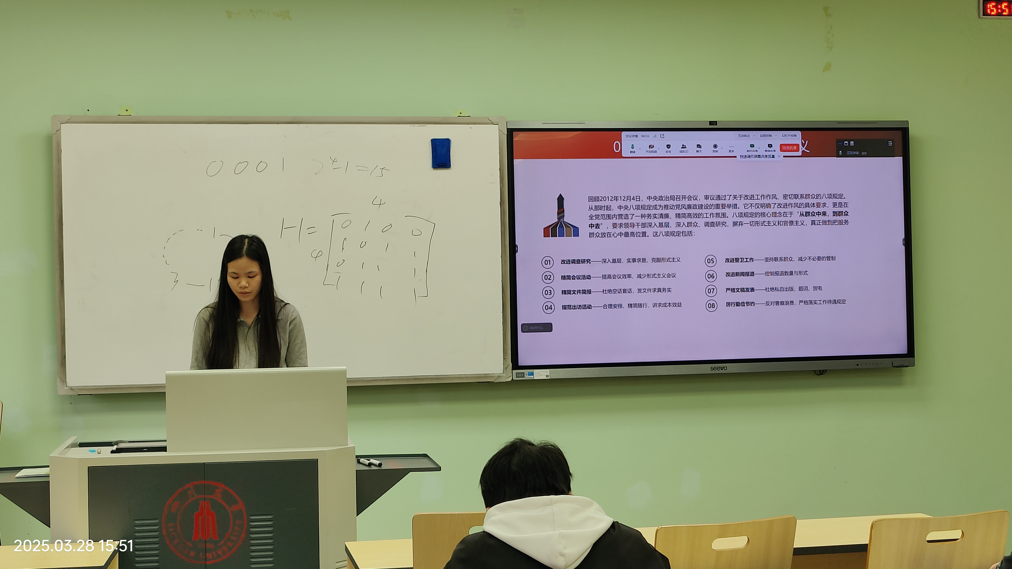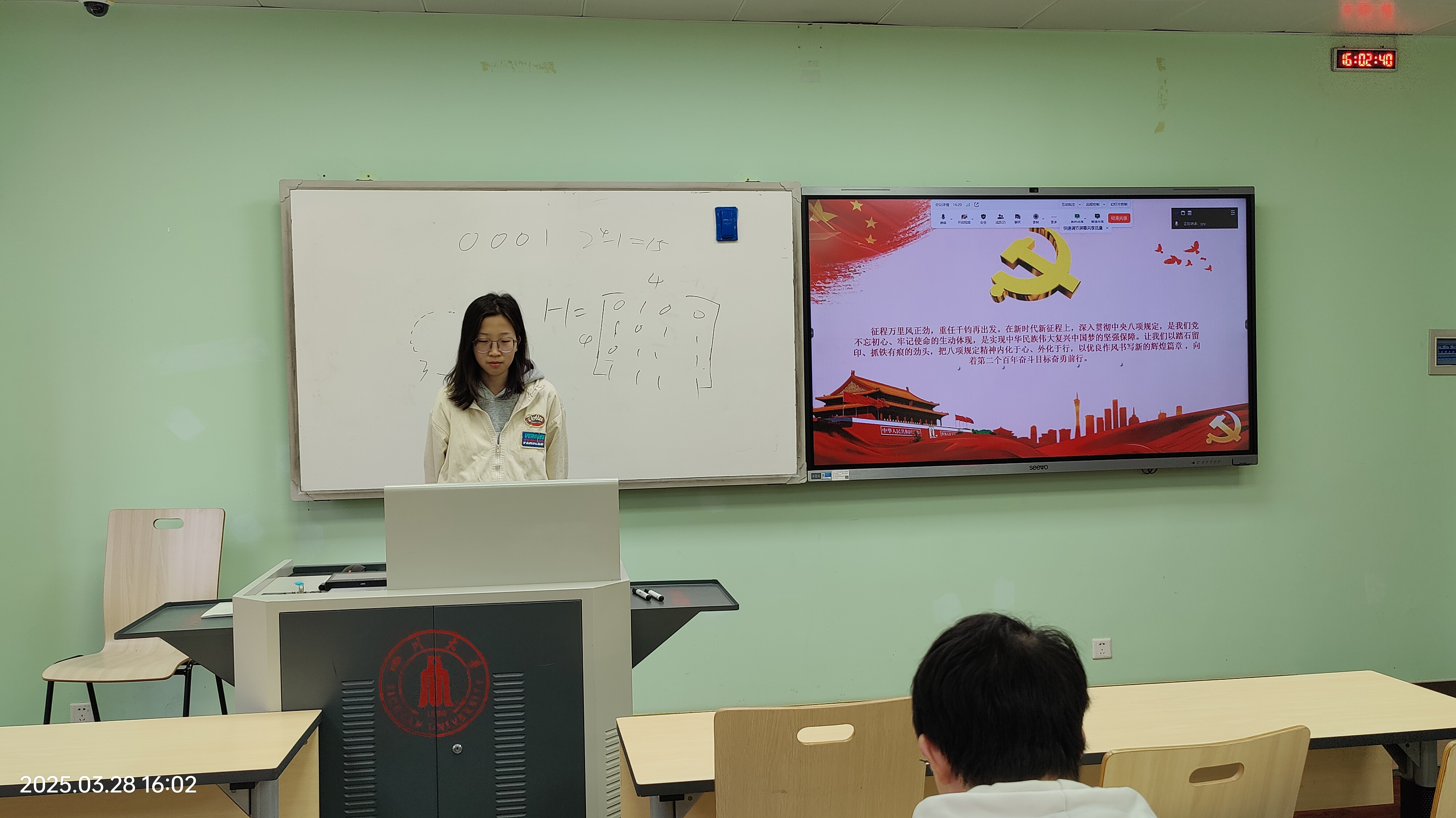 电子信息工程专业本科第一党支部于望江校区基础教学楼A-307教室举办主题党日活动。活动由刘清怡、袁伟恒两位正式党员主持,支部全体党员及17名入党发展对象参与学习,通过专题讲解与心得分享相结合的形式,深化对中央八项规定精神的理解与实践。
