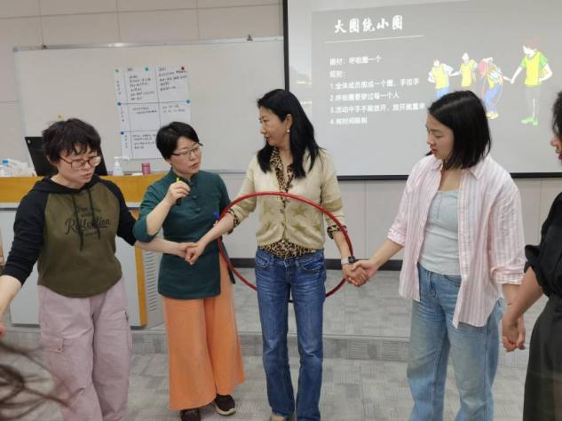 经过了前面两周的熟悉,团体沙龙来到第三周——团体凝聚阶段。凝聚力是团体的生命力,一个有效的团体,凝聚力是必不可少的,而信任是促成凝聚力的形成的重要方式,这个阶段准备了“信任倒”的游戏,团体分别用“双人信任倒”、“三人信任倒”、“风中柳”、“太空舱”等信任游戏,促使老师们觉察自己在生活中的角色,讨论“为什么信任这么难”增强了凝聚力的形成。