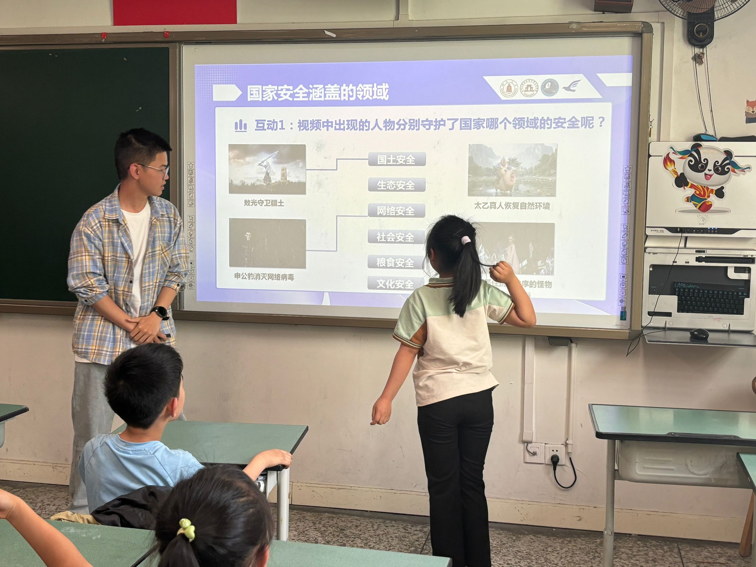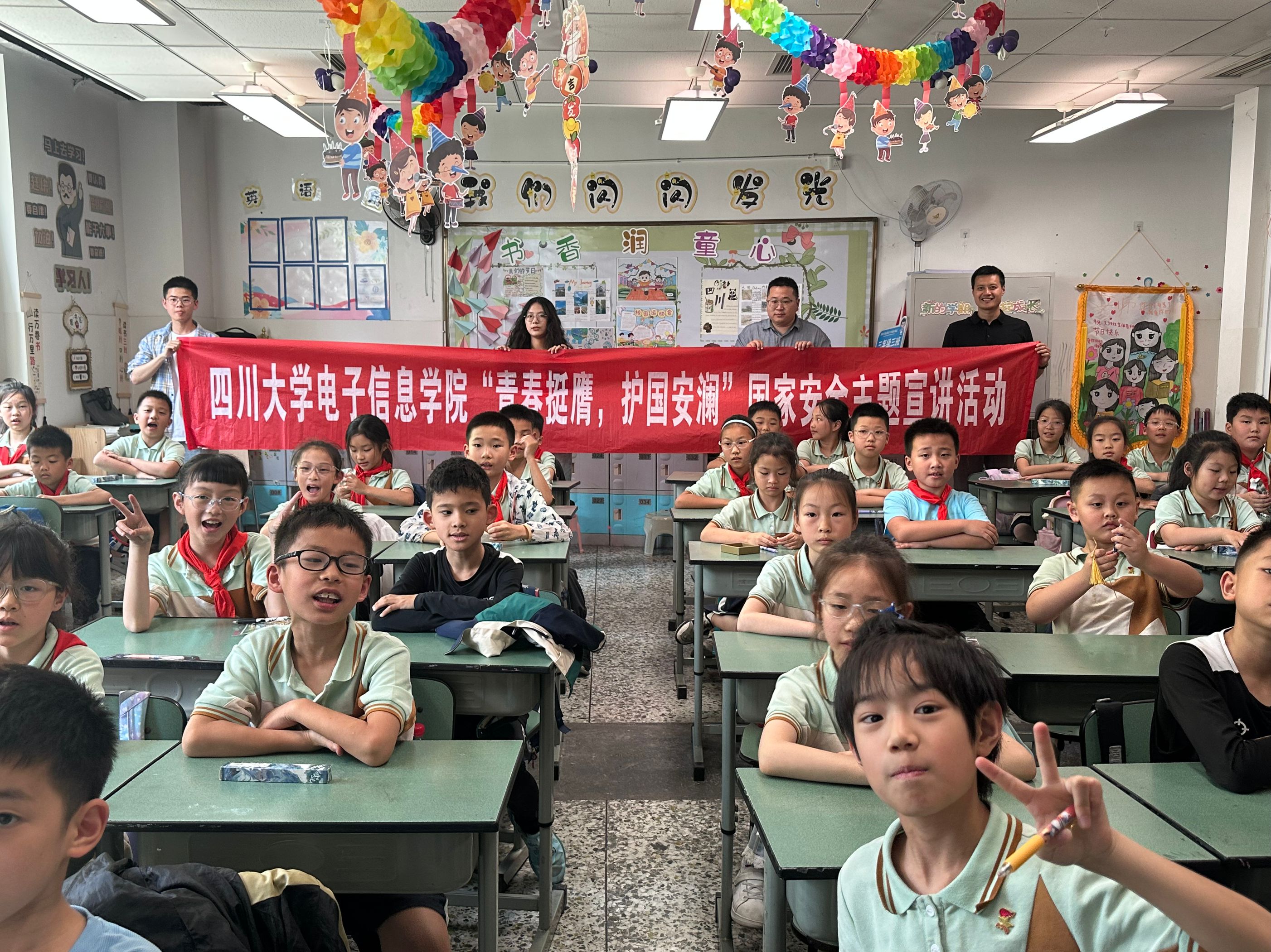 )“电子之鹰”青年宣讲团走进成都市盐道街小学,举办“国家安全,保密先行”主题宣讲活动,为小学生们呈现了一堂生动有趣且富有教育意义的国家安全课程。院团委副书记、宣讲团指导老师申鑫,兼职辅导员杨婉丁,宣讲团团长莫斌斌、成员陈炳汕参加活动。