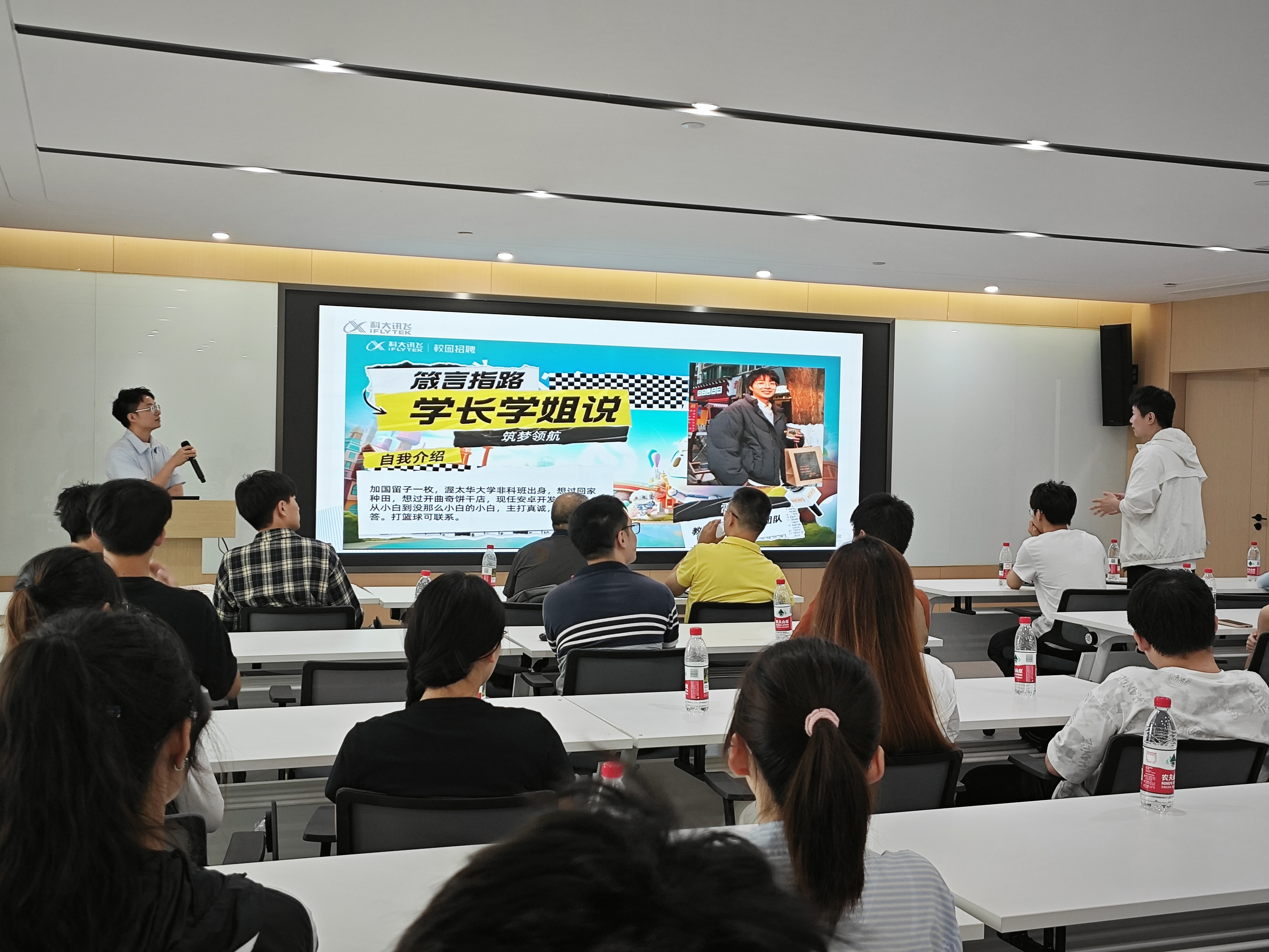 接下来,科大讯飞人力部工作人员详细介绍了公司发展历程、核心技术及产品生态。科大讯飞是亚太地区知名智能语音与人工智能上市公司,在人才培育方面,公司通过“雏鹰计划”“飞凡计划”等专项通道,为应届生提供技术培训、双导师制及清晰的晋升路径,强调“创新力与执行力并重”的用人理念。