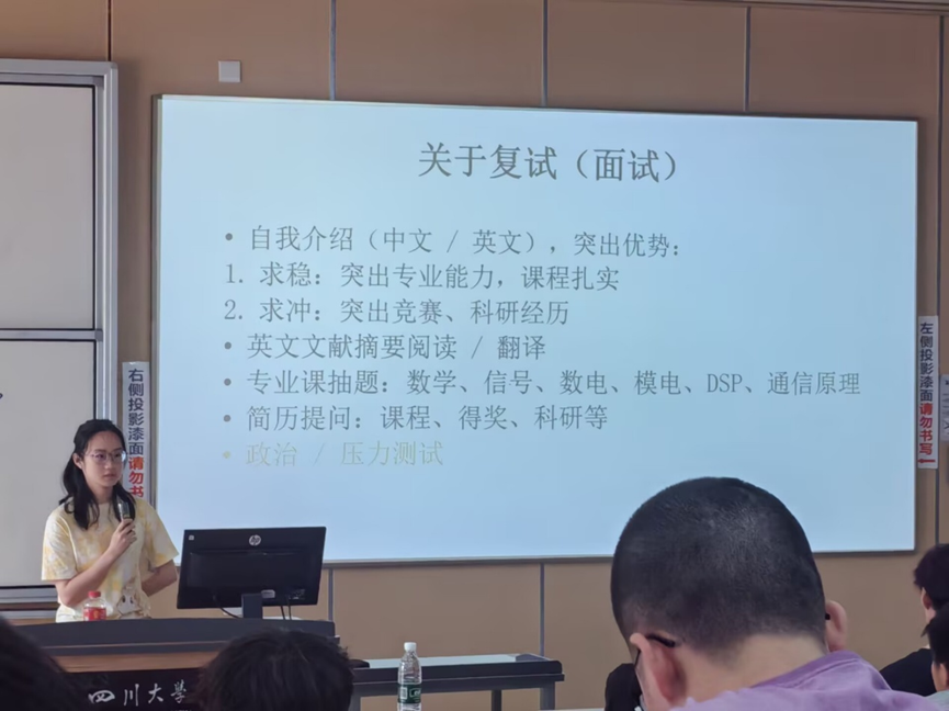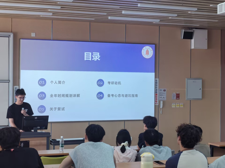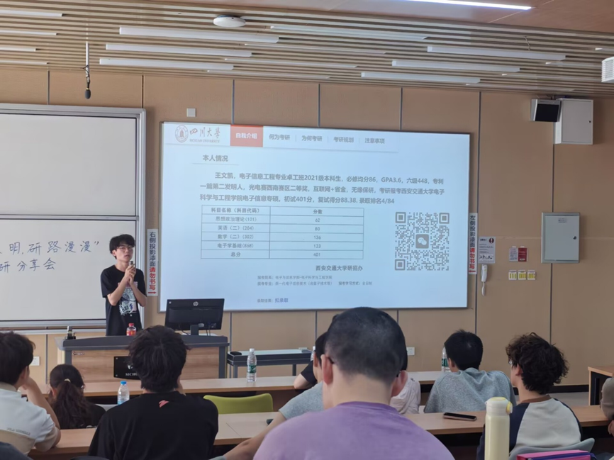 学风建设,聚焦广大学生在不同学段升学发展的具体需求,推动资源共享,争先创优,18XXX“星河长明,研路漫漫”考研分享会于5月24日下午在江安校区综合楼c105举办。本次分享会邀请了三名考研上岸的优秀学生分享经验,解答与会学生在考研学习中遇到的疑惑,帮助同学们理性规划考研院校和专业,提升考研技能。