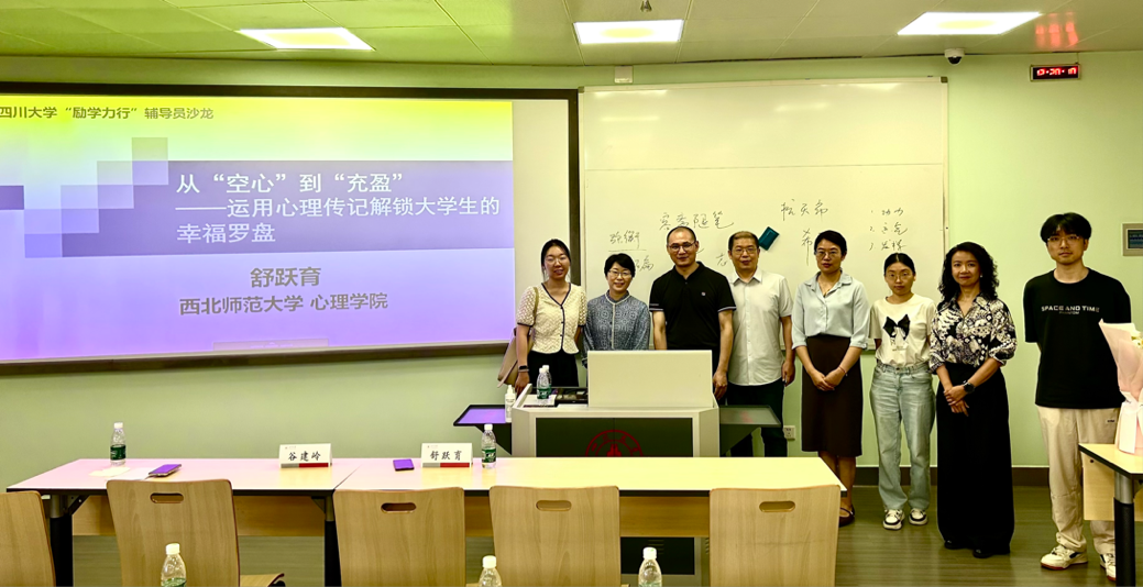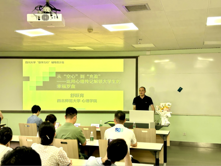 舒跃育教授主讲,主题为“从‘空心’到‘充盈’:运用心理传记解锁大学生的幸福罗盘”,活动由何惠老师主持,70余名师生参与沙龙。