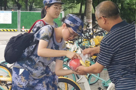 在孟滋常老师的指引下,各连队同学排好队伍,整齐有序地领取慰问品。此次慰问品由香蕉、苹果、石榴等水果组成,缓解了天气的酷热。廖勇明副书记鼓励大家在之后的训练中仍然要保持饱满的热情,乐观的心态,听从指挥,刻苦训练,为之后的学习生活打下坚实基础。