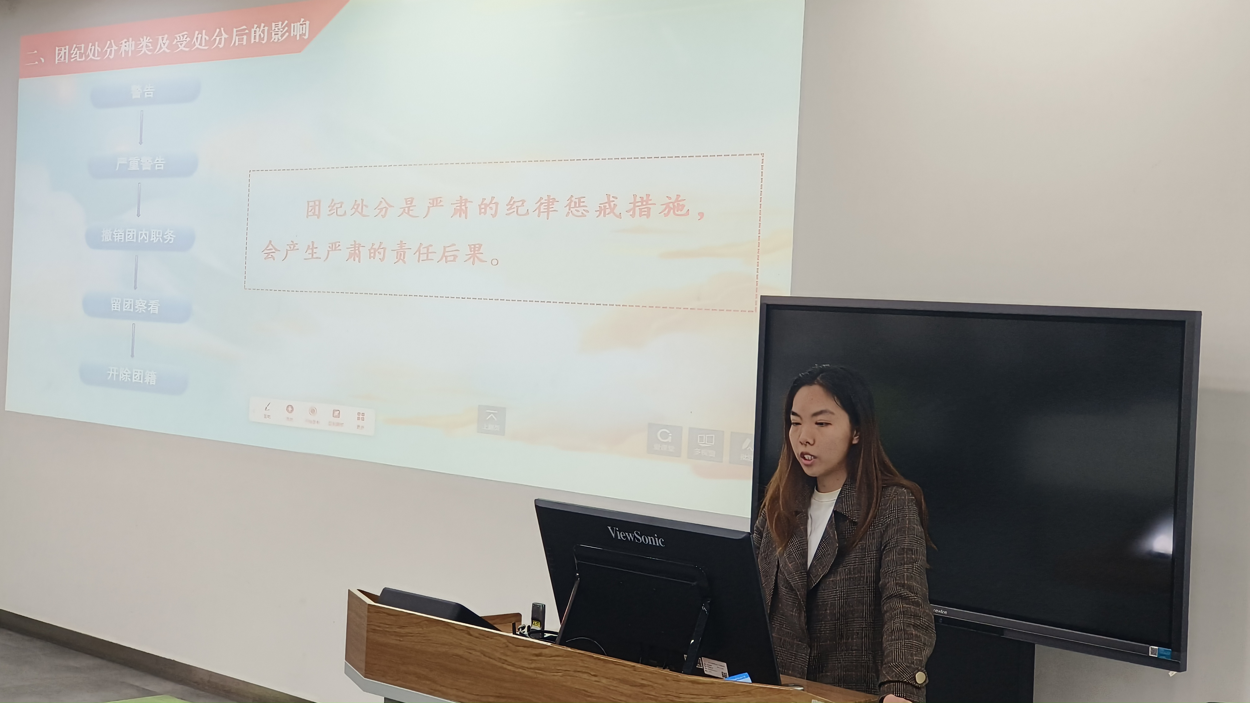 青年,在纪律规矩中淬炼成钢。在“砥砺前行·青年学习会”环节,2023级4班团支部书记易音彤组织全体团员集中学习《中国共产主义青年团纪律处分条例(试行)》。她通过逐条解读、案例分析和互动讨论等多种形式,让团员们对团纪团规有了更系统、更深入的理解。
