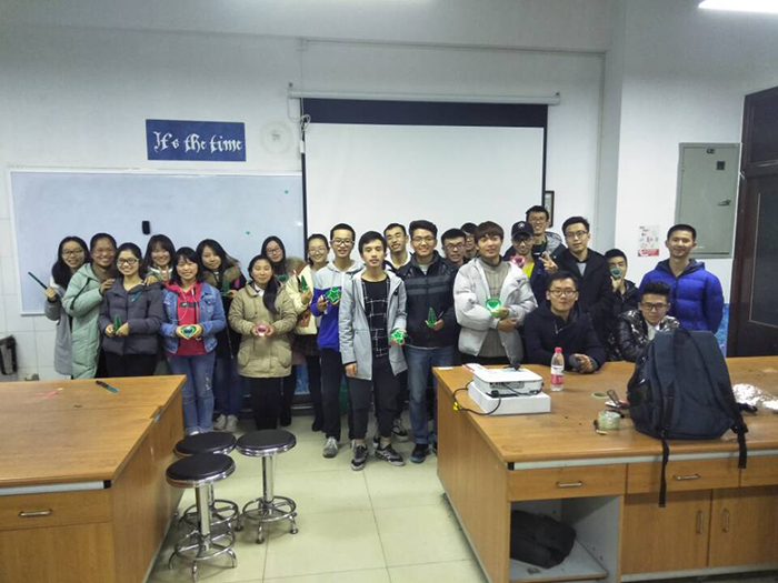 2017级全体同学进行了宣传,之后积极接受了同学们的踊跃报名,并从周一晚开始分发焊接材料。此后一周内,科技园内每天都有部长值班,部长们耐心答疑、指导并带领同学们完成DIY焊制整个有趣的过程。12月24日晚上7点,沙龙准时开始。同学们将一周的成果带到实验室进行展示交流,如五角星、摇摇棒、心形灯、彩灯小树,各种炫酷的DIY作品在一开始就烘托七起了全场的气氛。电子科技园技术部部长邱峻寅代表电子科技园对同学们的到来表示了欢迎,详细审视了同学们自己动手制作的DIY焊接作品,接着,部长组织了参与的同学们随机交换自己的作品作为年底礼物的活动,大家都写下了自己心底给对方的祝福,然后进入了欢快的游戏环节,现场气氛热烈,笑声连连,整场沙龙活动在欢声笑语中画上圆满的句号。