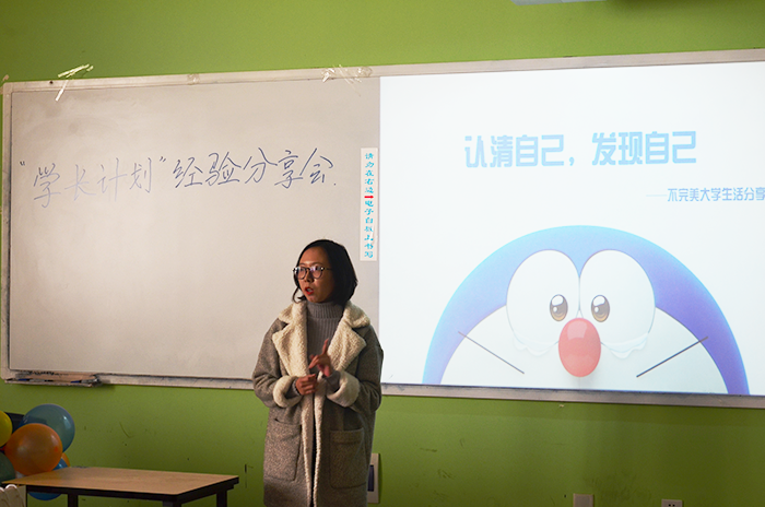然后是研究生史晓荻同学进行分享。她从学习和社团工作两方面进行介绍:学习上要认清自己,知道自己的不足,并分析高中和大学的不同,同时在学习时找到自己感兴趣的领域。大地辽阔,但你走的只有一个独木桥,因此要找到一个适合自己的。大学生不能只会学习,但学习是敲门砖。利用学生社团工作来锻炼自己,这能让同学们学到一些其他的能力。