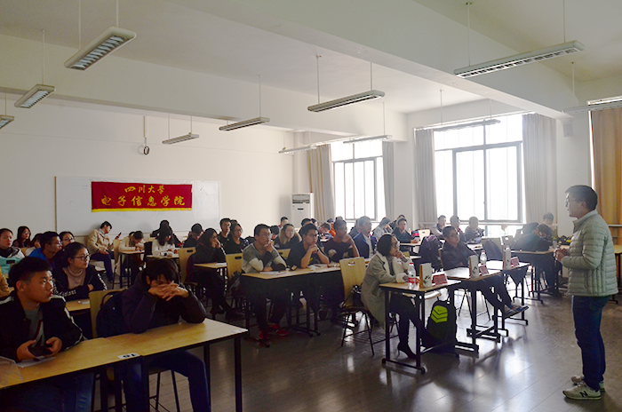接着是肖伟博士的分享。他主要从学习和未来的工作方面向同学们进行了介绍。他以自己的学习经历激励在座学生,不要因为环境而让自己堕落,要始终坚持学习。接着讲同学们要配演竞争意识,不甘落后。大一大二要努力学习,为以后深造打下良好的基础。然后他对自己现在的工作做了简单的介绍并告诉了同学们电子专业未来的发展前景。