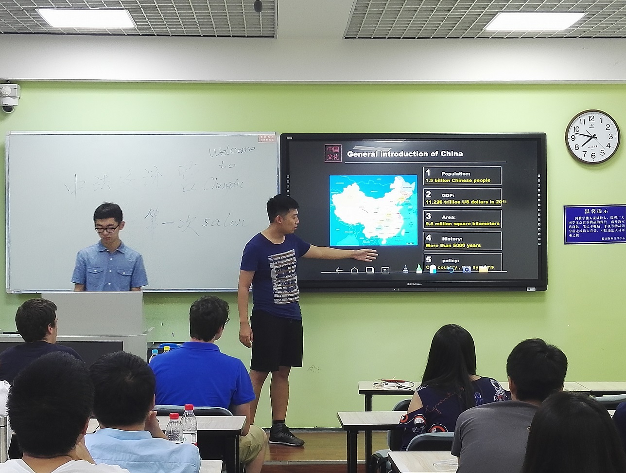 当天下午七点整,三所高校学生陆续到场。随后,七点十分,文化交流活动正式开始。首先主持人丁一铭同学对此次文化交流活动做了简要的介绍和说明。接着丁一铭同学开始介绍中国的传统文化。他通过PPT展示的形式,配和着有趣的讲解以及流利的英语口语,让同学们深入的了解了中国文化,并对中国传统文化产生了浓厚的兴趣。讲解完毕后,同学开始踊跃的提问。然后崔韩东同学又为大家介绍了成都的文化、美食以及著名的景点。现场活动气氛高涨。分享结束之后,中国科技大学的同学们又提出了一些他们对18XXX