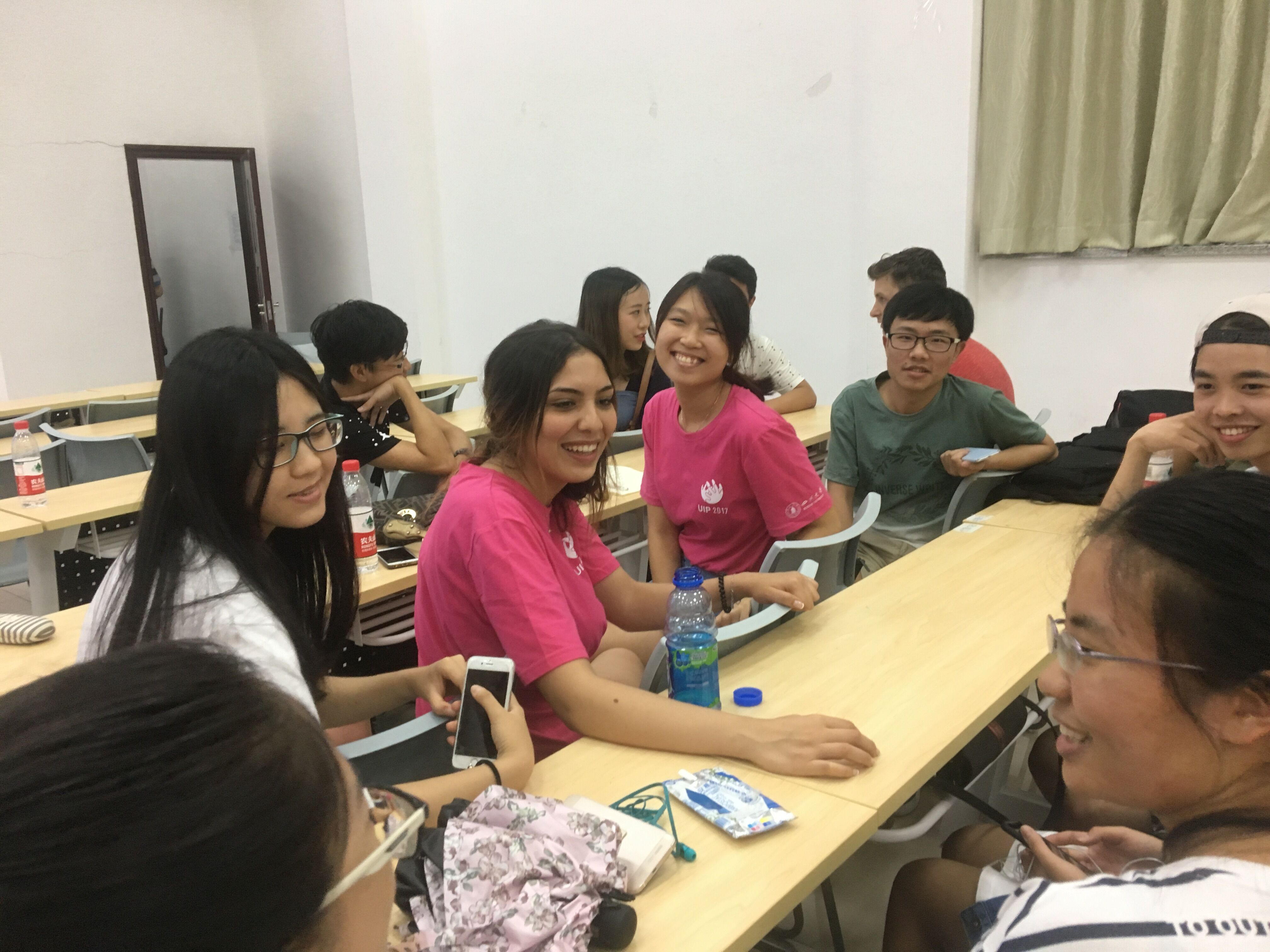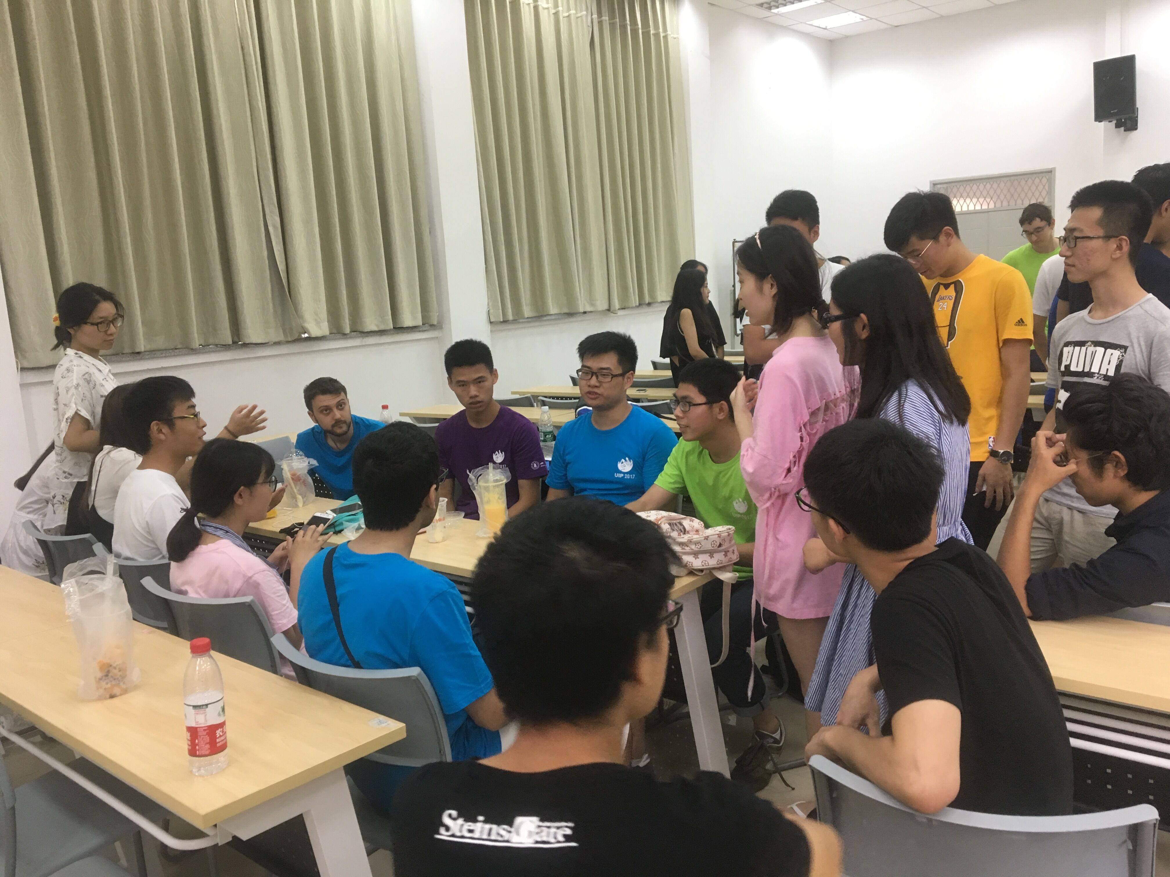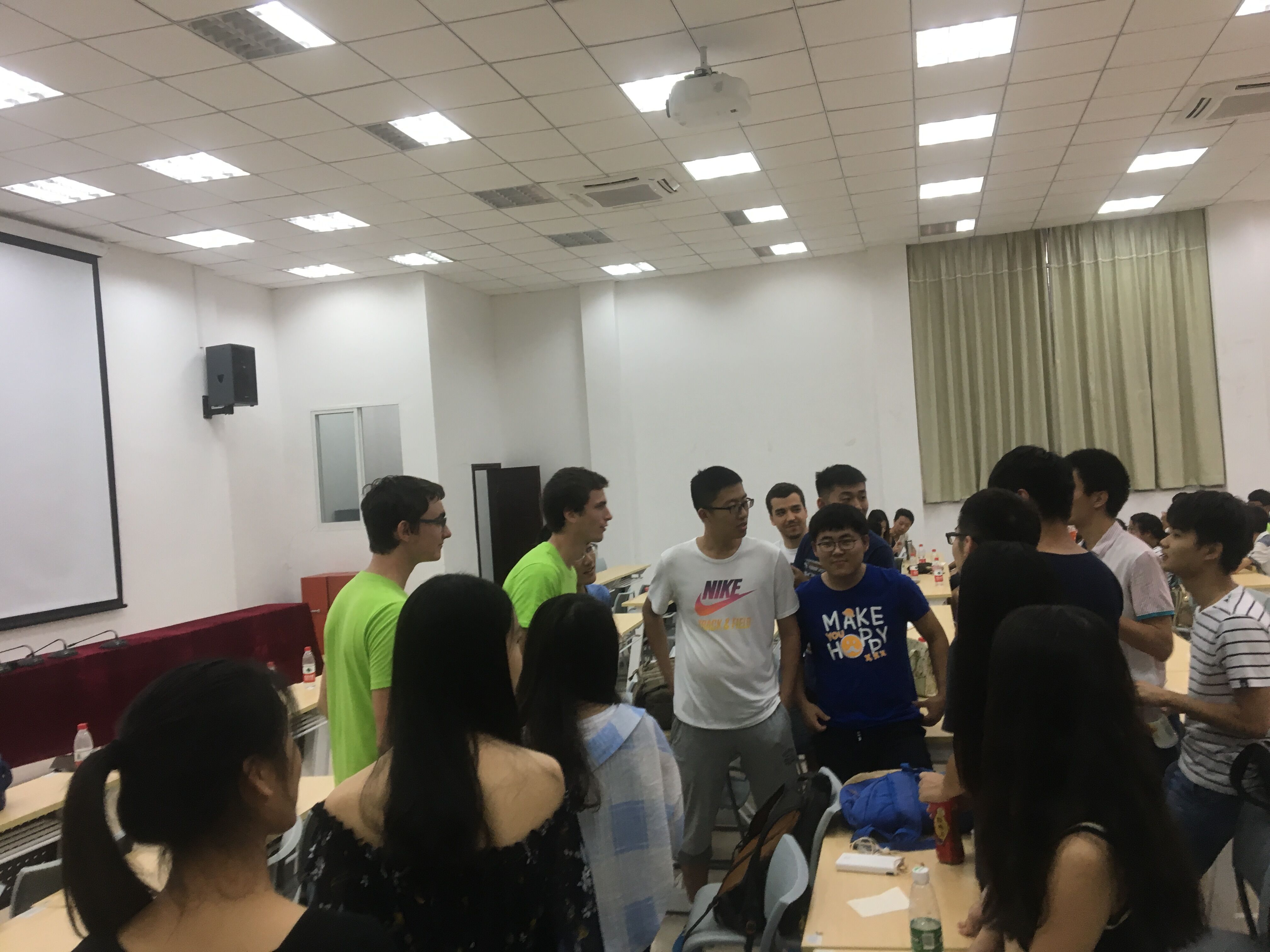三个国际交流营小组组长主动地向中国科技大学和国外大学友人表示热烈欢迎。之后,组长带头进行自我介绍,每个组员都积极地向高校友人进行介绍并对他们表示了热烈欢迎,关心他们是否适应中国的气候和生活习惯,交流的气氛逐渐热烈起来。国际交流营小组的学生为外国同学描绘了中国文化和川蜀风情,外国友人对此表现出了浓厚的兴趣,主动提议在之后的两周交流时间里去体验成都这座城市的魅力。另外,交流小组和来自中国科技大学的七位同学热情地沟通,因为组员和参与的中科大学生专业相仿,因此对一些专业问题进行了深入地探讨,大大拉近了彼此间的关系。之后中科大的卢傲然同学主动上台表演,大家都兴致盎然,纷纷鼓掌示意。一场精彩绝伦的相声贯口,将现场气氛推向高潮,众人纷纷拍手叫好。之后国际交流小组的同学邀请高校校友参观川大校园,大家离开会场,18XXX