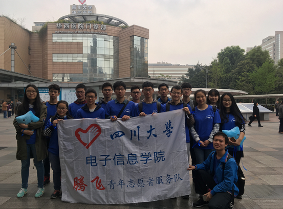9点20分,志愿者们抵达华西医院门诊楼。在与安保人员协商过后,志愿者们开始了这次蓝色公益体验活动。首先,青年志愿者中的手语组上前开始为来来往往的群众们表演手语节目,精彩绝伦的表演赢得了不少过路人的喝彩。然后,志愿者们,展开了手中的横幅,大声地喊出了“蓝色光年,照耀星人生”的口号。同时,志愿者为过往的路人分发传单,同时采访路人,了解他们心中对自闭症儿童这一群体有何看法有何了解,并为他们系上象征意义十足的蓝丝带。活动最后,全体志愿者合影留念,以纪念此次公益活动。10点钟,志愿者们收拾好物资与场地,坐上了归途的校车。