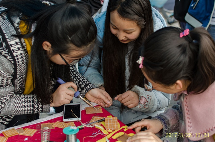 早上七点三十分,负责本次活动的两院主席团助理全部到场。他们将物资摆放到位并熟悉场地,为活动的有序开展做最后的准备。八点整,活动正式开始。由于该时段正处于上课时间,青春广场上人流量不多,一些文科专业的同学看到摊位上摆放的电烙铁和锥形瓶后十分好奇,纷纷上前参与。值班人员耐心讲解使用电烙铁的方法和注意事项,在亲自展示焊接方法并确保没有安全问题后协助同学完成了焊接。每位参与游戏的同学自己设计焊接图案,认真谨慎地使用电烙铁,使得整个摊位秩序井然,活动得以顺利进行。