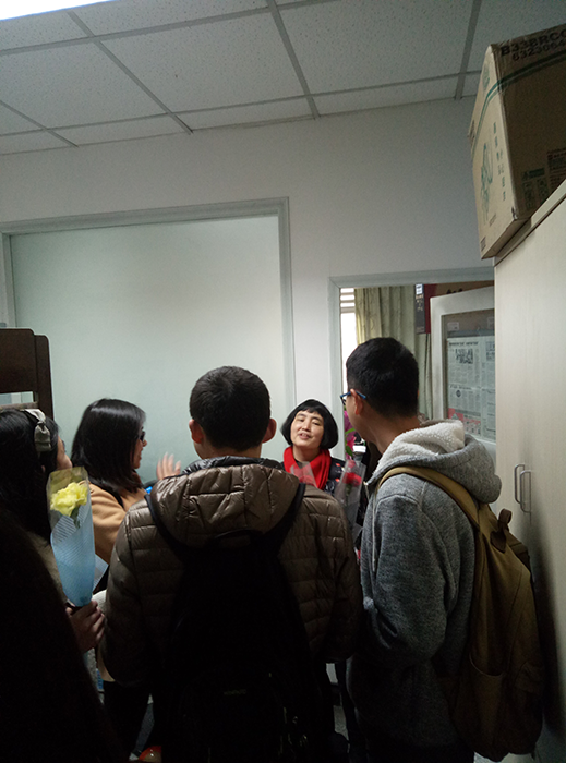 办公室。看到志愿者们的到来,老师们都亲切地跟同学们打招呼,同学们也热情地向老师们问好,并欣然拿出自己藏在身后的鲜花送给老师。老师们感到很欣慰,在短暂却愉悦的交流之后,志愿者们开始了办公室的清扫活动。志愿者按照事先的安排,先用水桶打来一桶水,然后将抹布润湿,认真擦洗办公桌和窗户等地方;同时,两个志愿者用扫把仔细清扫办公室的杂物和灰尘,并拿来拖把进行清洁。在大家的辛苦打扫下,办公室很快变得干净起来,随后志愿者们对老师们的文件资料等进行了整齐的摆放,办公室一片整洁。最后志愿者们对清扫工具进行了整理。16时45分,志愿者们再次给女教师们送上了节日祝福,与老师们道别后,踏上归途。