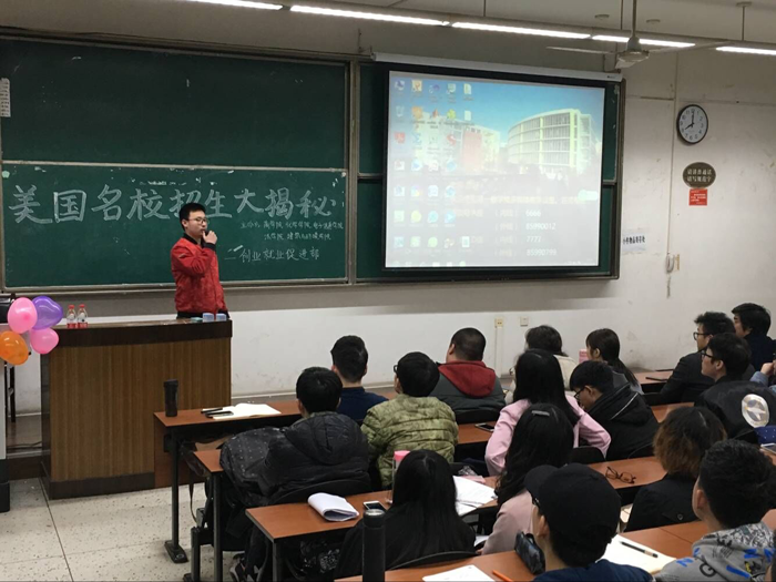 、建筑与环境学院、法学院、商学院五个学院的团委学生会创业就业促进部联合举办的美国名校招生大揭秘讲座在18XXX