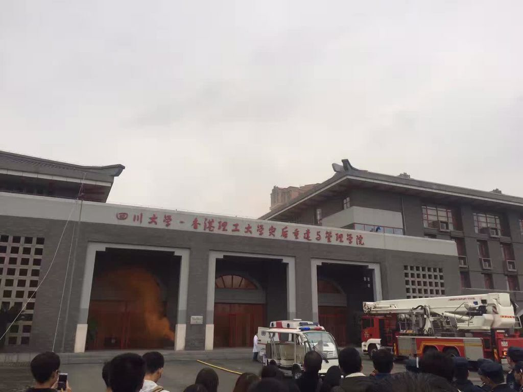 演练现场,随着尖利警报声划破灾后重建学院的宁静,学院楼前空地,两辆消防车以及校医院救护车先后急速赶到。数名武警消防官兵从车内跳出,携装备迅速进入火场实施火灾扑救和人员搜救。巨大的水柱从压力水枪直喷入二楼着火点,火情很快得到有效控制,浓烟渐散。一名受伤学生被抬上救护车送往就近医院抢救。在学院工作人员、校保卫处勤务大队、校医院以及成都消防官兵等多方配合下,整个人员疏散与火灾扑救工作顺利完成。