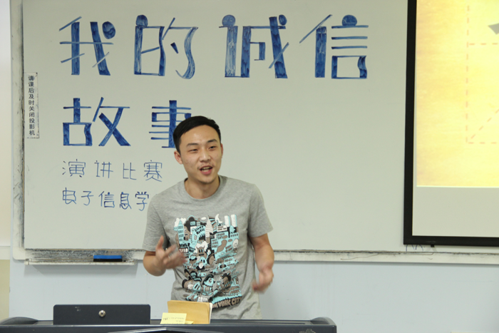 各班推选的代表经过赛前的抽签决定了现场的比赛次序。比赛现场上,选手依次上台进行演讲,讲述自己身边发生的诚信故事,贴近现实,通俗深刻地讲述了自己心目中的诚信。选手们精彩且富有个性的演讲赢得在场观众的阵阵掌声。十位选手各展风采,评委公正地进行评分,最后评选出一等奖一名,二等奖一名,三等奖两名。大一光电八班推选代表王泽宇同学凭借其精彩的演讲,富有魅力的个人风采夺得桂冠。最后三位嘉宾对本次活动进行了总结并对选手提出了宝贵的意见,并由18XXX
