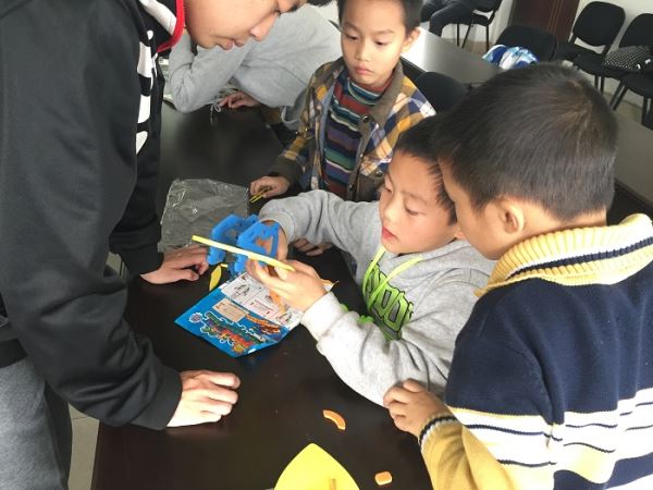 在活动的过程中,同学们在志愿者们的引导下,参考着简易的说明书,自己动手进行组装。同学们情绪高涨,积极参与,在小组内分工合作。不时有同学向志愿者们询问,志愿者们带领着同学们,或解释部分零件的作用,或让同学们自己思考零件的组合。虽然也会有一些类似于漏用零件的小失误,但同学们在自己的思考后都能发现错误并及时改进。不一会儿,在同学们和志愿者们共同的合作下,一艘艘简易的泡沫船车就组建好了。五个小组的同学们都兴致勃勃地装上电池,迫不及待地放在桌上开启开关。在看到小船车顺利移动后,同学们纷纷发出成功的欢呼。一时间,五艘小船车彼此赛跑,十分有趣。很快,时间来到了14时,志愿者们与同学和老师道别,不舍地踏上了归校的路途。