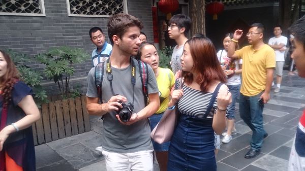 此后大家一起前往成都著名景点宽窄巷子。熙熙攘攘的宽窄巷子囊括了部分中华文化的精髓,如琉璃、川剧、唐装等,这些中国特色文化符号展示在外籍留学生面前,引得他们不时驻足拍照,赞叹精湛的工艺作品和绝伦的艺术表演,并且选取了喜爱的纪念品作纪念。一路上中外学生不断就生活、学习等等一系列方面的问题进行交流,而外籍留学生更表现了体会出了文化的差异不同,而18XXX