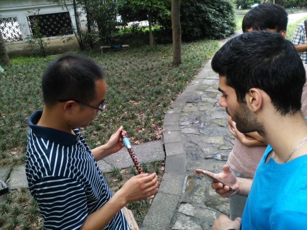 活动开始,我们带领着留学生了解了中国传统竹笛,并聆听了一首悠扬空灵的《牧民新歌》,对中国的传统音乐乐器文化有了更多的了解。接着,我们一行去参观了锦里小吃街,Ghali还在街头画了一幅素描,并和我们交流了一些有关巴黎街头艺人的文化场景。最后,为了让留学生们更好的了解巴蜀文化,我们带着Ghali尝试了成都特有的“掏耳朵”,给他留下了深刻的印象。