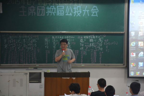 下午3:30,换届选举准时开始。首先,江安校区团委学生会副书记全婷婷同学宣布此次换届选举的细则。接着由11位参选的同学分别上台进行竞选演讲。每位竞选者将自身优势、不足以及对未来工作的展望都在自己的演讲中体现出来。演讲完毕后,团委全体干事及各班学生代表对参选同学进行投票。最终,赖林同学当选2015年团委学生会副书记,刘嘉程同学当选团委学生会执行主席,崔林旭同学当选执行副主席,许一宁同学当选执行副主席兼青志队长。竞选结束后,由团委书记李运国老师发表讲话,表达了对4位当选者的祝贺以及对未来18XXX
