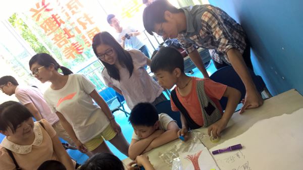 不一会,机灵的同学纷纷完成了自己组的模型,迫不及待地冲向了水盆。看着自己亲手制作的船只在水中劈风斩浪,同学们都兴奋地跳了起来,激动的同学甚至给旁边的同学来了一个大大的拥抱。时间很快就指向了16时,虽然欢乐的时光如此短暂,志愿者们还是只能依依不舍地告别同学们,踏上归途。