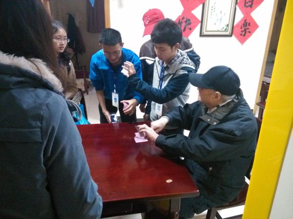 敬老院的负责人阿姨把同学们带入了敬老院。一位已94岁高龄的老奶奶见到了同学们,按捺不住心中的激动从座位上站了起来,同学们连忙将老奶奶扶回座位并依次和奶奶热情地握了手。主任又耐心地向同学们大致地介绍了一下老人们的情况。老人们见到同学们,仿佛见到了自己的孙子孙女们,喜悦之情溢于言表。同学们接下来便与老人们促膝长谈。虽然老人们大多已年过古稀,但在与同学们亲切交心时却依然神采奕奕。在谈到老人们的过去时,他们或慨叹,或兴奋。同学们无不倾心相听,耐心以待。有一位老人谈起过去,想到现在,感叹自己的半生蹉跎,鼓励后生们努力学习文化知识,争取报答社会。老人说到动情,眼角泛起了泪花。同学们听罢无不振作精神,说道:“我们定将更加努力。”一位爷爷在与同学们短暂接触后,毫不吝啬地“秀”起了纸牌魔术。魔术虽然简单,但在爷爷的倾力演绎下,别有一番趣味。同学们围观着爷爷的绝技,气氛轻松有趣。另一位爷爷则与同学们进行着亲切友好的交谈。谈起了过去自己的书画收藏史,老人滔滔不绝。而同学们仔细地听着,不时地与爷爷进行学术上的小交流和小讨论。而此时有一位爷爷睡意来袭,同学们耐心地询问他的需求,最后几位同学把爷爷缓慢有序地送到了床上。接下来有几位同学来到了敬老院的二楼,对几位奶奶进行了慰问。奶奶见到同学们,显得大度而亲切。同学们与奶奶交谈甚欢。在奶奶们的言语中,往事历历在目,鲜明生动。虽然其中一位奶奶年事已高,在语言组织方面的能力已然有所弱化,但同学们依然耐心地引着奶奶,认真地与奶奶交心,分享着时光的快乐。不多久,有三位长辈们外出散步归来,一位同学便与爷爷奶奶们打起麻将来。无关赌博,在麻将的碰撞声中,大家欢乐而轻松。促膝长谈,吸取先辈的经验在进行中,麻将在进行中,陪老人看电视在进行中,大家便在这样轻松而庄严的气氛中度过了短暂的两个小时。最后,同学们与老人们合了一张影,与老人们依依不舍地道别了。老人们热情地欢送,与同学们握手道别。活动便在这种和谐的气氛中结束了。