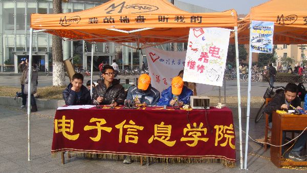 本次活动主要由“腾飞”青年志愿者服务队宣传,给有损坏小电器的同学通知与宣讲,然后由电子科技园的技术人员对在维修范围内的损坏品进行维修。早晨9点,两个部门的干部就在青广上建起了一个街边小维修站,并且不断向来往的同学宣传此次活动。之后,陆陆续续地,就有好几位同学拿着打不开的台灯、用不了的鼠标、耳机和计算器跑来维修。于是值班的干事细心地为维修品一一做了标签和登记,然后交给电子科技园的同学们进行维修。在使用换灯管、万用表等多种方法后,他们判断出了电器损坏位置以及维修了在自己维修能力之内的电器。