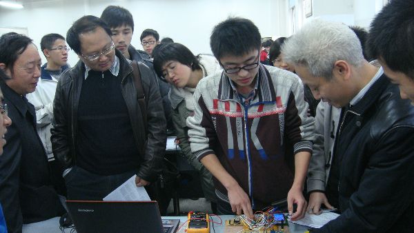 的同学参赛。上午九点,各个参赛队伍领回作品进行最终的调试。十点,比赛以课题“汽车振动谱测量及车型识别”、“城市智能路灯系统”、“基于手机的人体生命特征数据监测仪”、 “环境电磁能量收集装置”、“两路电子乘法器” 和“LED点阵书写显示屏”的顺序进行评审,评审老师们耐心地听参赛同学的设计思路以及实现功能的方法,并作品所能达到的效果加以验证,还关注了参赛作品的元件使用。直到下午,本届“锦电杯”科技创新大赛圆满落幕。