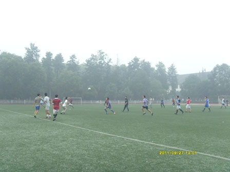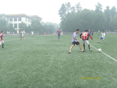 研究生新生顶着蒙蒙细雨在东区足球场展开了一场激烈的友谊赛。