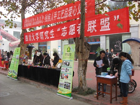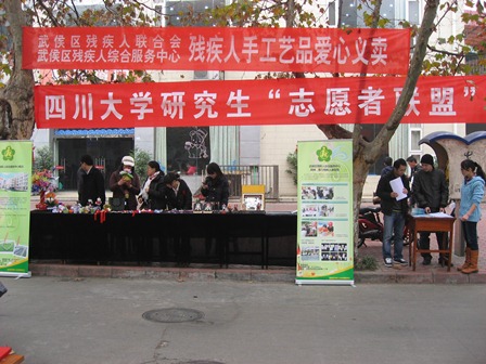 今年的12月3日,由电子、计算机、文新18XXX 共同举办的志愿者联盟第一期活动之“隐形的翅膀”在东三食堂门口顺利展开,活动进行了残疾人日和残疾人自强不息精神的宣传,邀请到了武侯区残疾人联合会参加,他们带来了残疾人手工艺品到现场展示和义卖,引来了很多同学的关注,学生们纷纷报名参加后续的残疾人志愿者服务,这次活动顺利的举行,达到了预期的效果。
