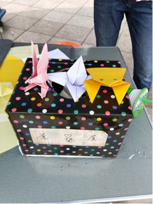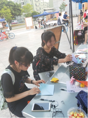 江安校区青春广场集合。八时左右,志愿者们完成摊位物资整理和摆放工作,正式开启了宣传活动。此次活动,每个时间段的志愿者们分工合作。有的志愿者主动向路过同学介绍本次活动内容,并诚挚邀请他们参与活动。另一部分志愿者在摊位处指导参与同学,向他们介绍参与方式。让他们写下对孩子的祝福或鼓励话语后,将纸片折成简单形状。由于部分同学对于折纸并不擅长,志愿者们还耐心教他们一些基础的折纸方案。活动于下午六时左右结束,志愿者与负责人整理物资、场地。
