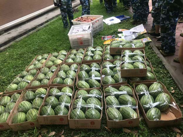 此次军训送清凉活动中,分发的水果由学院统一购买,每位参与军训的同学都可以获得一个三斤左右的西瓜、一个梨和一个苹果。活动分两批进行,女生于中午十二点在西园十一舍领取,由卢萍老师为她们分发。男生于十二点半在三八广场领取,由陈笃海副书记和孟滋常老师为男同学们分发。活动期间,同学们依次排队领取,整个过程井然有序。陈笃海副书记、孟滋常老师和卢萍老师认真、耐心地为每一位同学分发水果的同时,还对同学们军训期间的训练情况进行详细询问,问寒问暖。