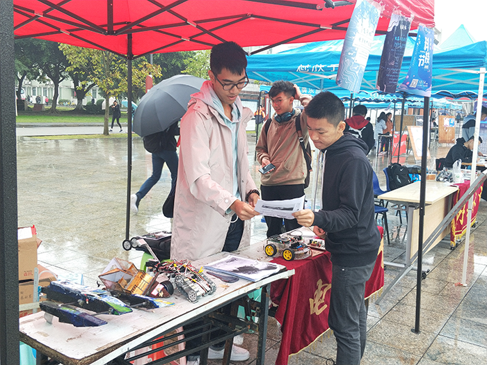 上午八点整,博览会正式开始。值班人员精神饱满地坐在摊位前,展现出电子科技园自信的一面。每当有人来摊位参观电子科技园的展品时,值班人员总会向他们热情地介绍展品的名称,创作背景,以及所蕴含的意义等信息,他们想通过这些信息让咨询者能够对科技园的活动有更多的了解。而且,电子科技园还将比赛中的一些优秀作品展示了出来,例如:船模大赛的获奖船只、智能小车、以及一些优秀的电焊作品,旨在通过这些优秀作品来提高他人对电子科技园的兴趣。本次活动为期两天,电子科技园将在这两天中向全校师生展示出它的有关科技的一面,让大家能够多多了解电子科技园。