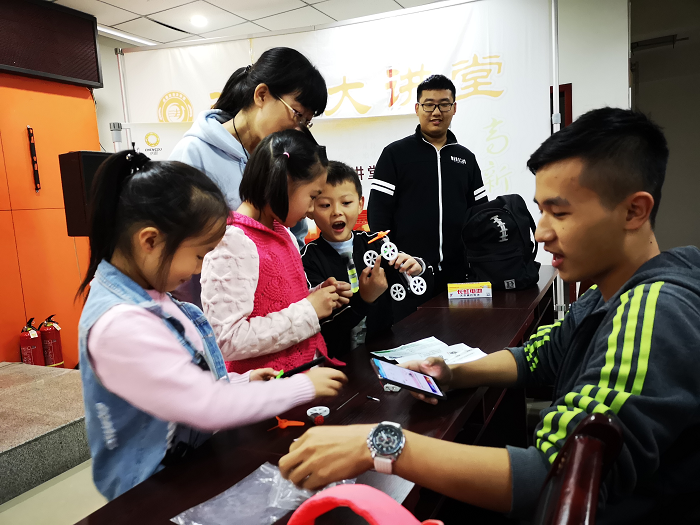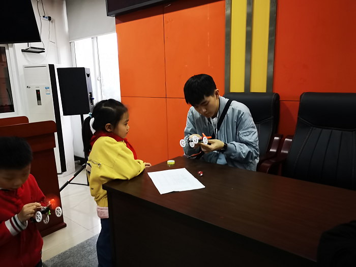首先,志愿者们拿出准备好的电子小车,交给小朋友们动手组装。组装过程从清点零件开始,小朋友们都十分投入。(图一)组装过程中,小朋友们遇到不能完成的步骤,就积极询问志愿者。志愿者们都耐心地手把手交给小朋友们如何组装,边教边让小朋友自己动手尝试(图二)。在最后手工活动即将结束之时,一个小朋友的小车出了故障,她匆忙找到志愿者寻求帮助,志愿者在仔细检查了她的小车之后,找到了解决方法并且细心地将她的小车修好(图三)。看着小朋友满足的笑脸,志愿者们心中都感到无比的温暖。
