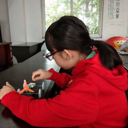 安装过程中,同学们已经清楚风力小车的运动原理,即电力带动螺旋桨转动产生风,风力带动小车运动。不少同学尝试吹动螺旋桨转动来带动小车,也有不少同学提前完成风力小车的安装并在其他同学有困难时主动帮助他们或分享经验。安装完成后,同学们开始检验自己的成果。有些同学的小车因车轮安装较紧而无法运动,及时改进后,小车正常运动。