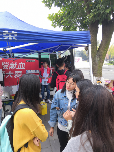 早上八点半,志愿者们来到青春广场旁集合,等待献血车的到来。九点左右,在献血车来到了江安校区后,志愿者们便马上来到自己的工作岗位上。与此同时,一旁早早等候的献血的同学们也来到献血摊位开始填表。