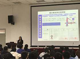 电子科学与技术专业,是在场同学们的学长。他的介绍言简意赅,使同学们对激光技术的应用有了更进一步的认识;杨晓敏教授以一部科幻片生动地解释了视觉增强的概念,在介绍的最后表达了对同学们期待,她说道:“未来是你们的,希望大家以学术的行动去拥抱未来”。