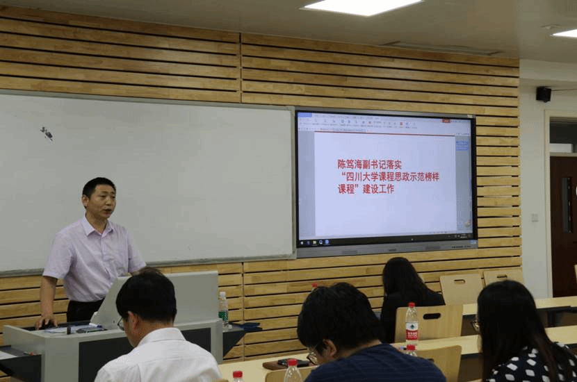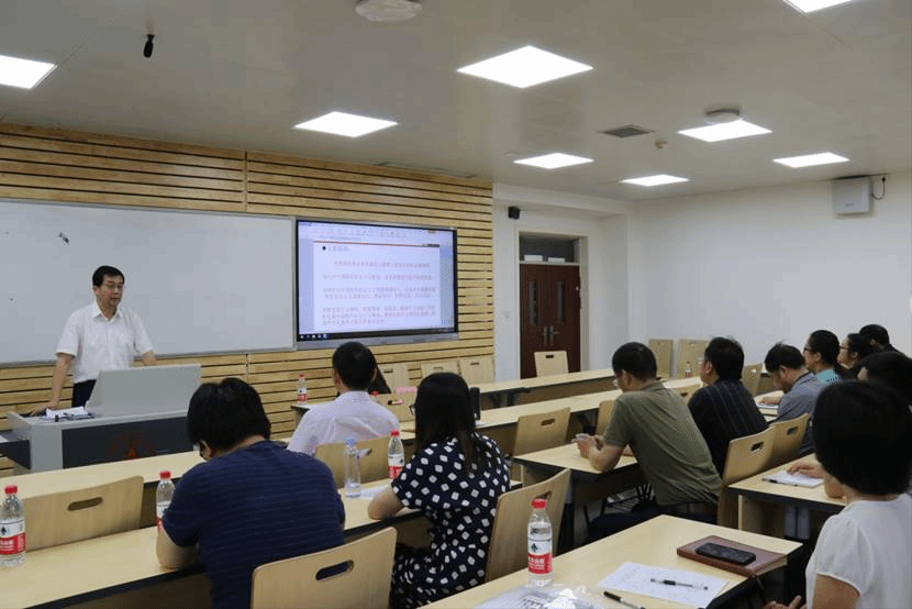 课程思政示范榜样课程”建设工作。他指出,课程思政即以社会主义核心价值观来统领人才培养的全过程,充分发挥价值引领和品德塑造的作用,形成各类课程与思政课程同向同行,各个环节相协同,来实现立德树人目标的高水平教育教学模式。此外,他还传达了学校的相应措施,指出学校将分步骤逐步推进相关模式改革,主要从榜样教师和课程两个部分着手改革。最后,他结合学院实际,传达了学院的相关方案,并举例阐释了思政教育在课程中的具体实践方法。