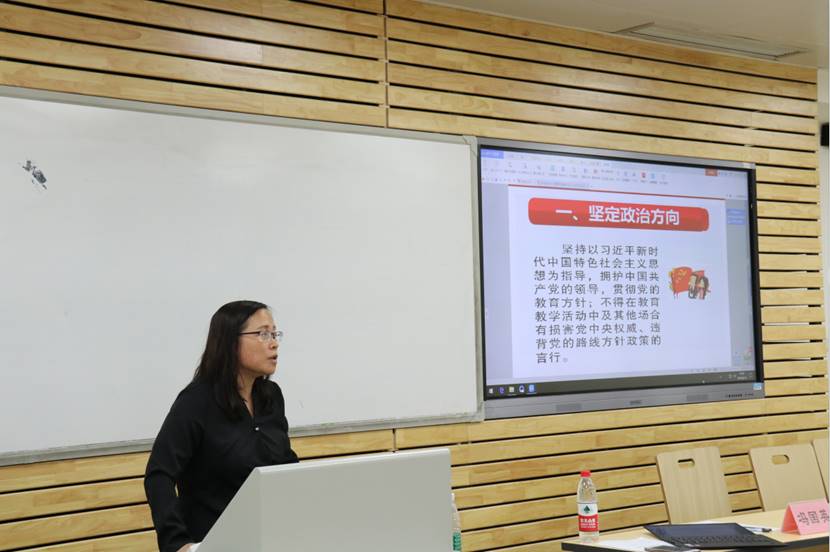 接下来,冯国英院长组织教师学习了《新时代高校教师职业行为的十项准则》。宣读《新时代高校教师职业行为十项准则》的同时,她结合学院实际分别从坚定政治方向、自觉爱国守法、传播优秀文化、潜心教书育人、关心爱护学生、坚持言行雅正、遵守学术规范、秉持公平诚信、坚守廉洁自律、积极奉献社会十个方面解读了新时代高校教师职业行为十项准则。冯院长强调,教师是国家教育事业的承载者,承担了教育、培养祖国新一代的重任,须坚持正确的政治方向,坚持以习近平新时代社会主义思想为指导,拥护中国共产党的领导,贯彻党的教育方针,不得在教育教学活动中及其他场合有损党中央的权威,违背党的路线、方针、政策。