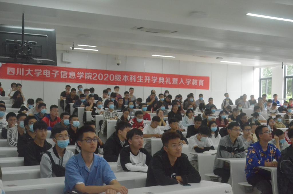 本届新生开学典礼在江安校区综合楼举办。共设有一主一分两个会场,以容纳所有到会领导及全体2020级本科生。领导及部分本科生在主会场就座,分会场的学生通过摄像头及会议软件观看庆典。