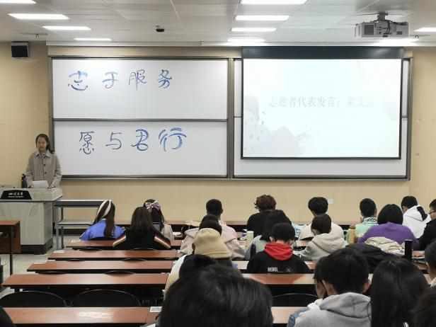 腾飞青年志愿者服务队的队长史遵琳同学作为部长代表上台发言。史队长简洁而有力的发言里透露着对青年志愿者服务队未来的美好展望,新干事们认真聆听,颇受鼓舞。随后,建筑与环境学院的梁文清同学代表志愿者进行了演讲,表达出新干事们对加入青年志愿者服务队大家庭的欣喜,以及对志愿服务工作的向往与憧憬。