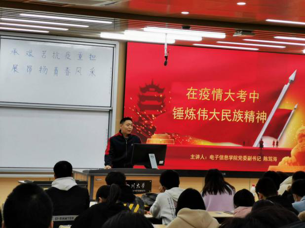 在主持人开场白过后,陈笃海副书记以“在疫情大考中锤炼伟大民族精神”为中心为同学们进行授课。他从中国在抗疫时的表现开始讲起,勾起同学们共同的回忆,并且对于党的出色表现感到由衷的骄傲。紧接着陈笃海副书记又深入浅出地为大家讲解了何为中国精神,为在座正值青春年华的的学生们指明努力的方向。