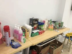 为同学们在自习室的一角配备了丰富的物资:咖啡、茶叶、驱蚊水、插线板等,也应常态防疫要求配备了足够的免洗手消毒液等防疫物资。