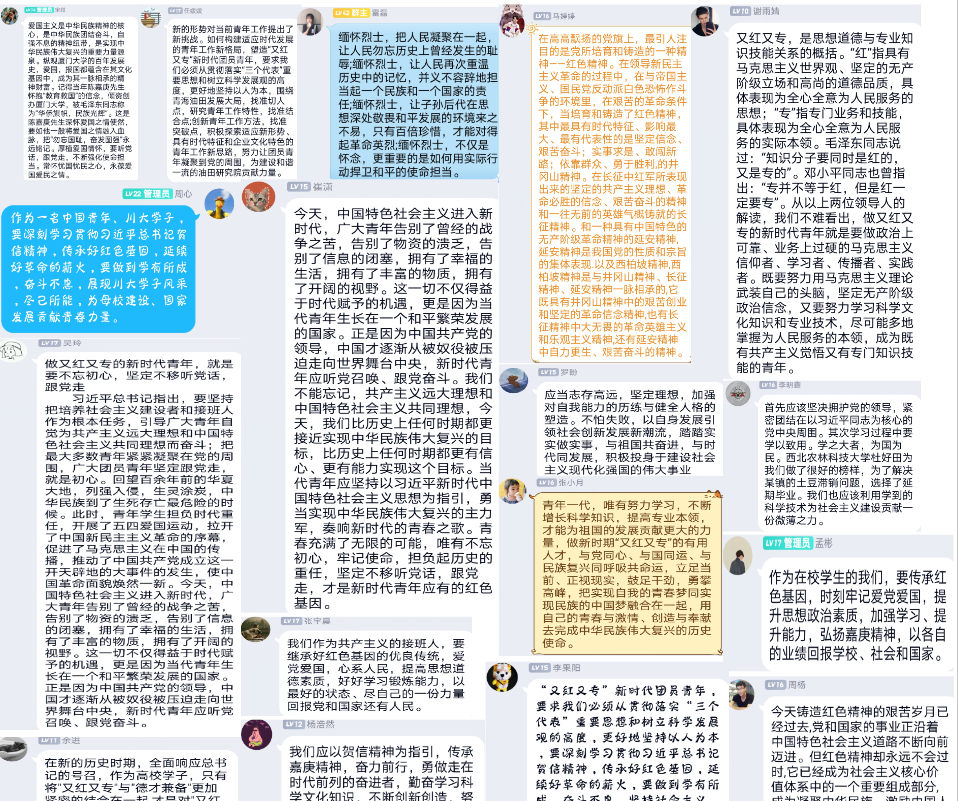 通过本次活动,同学们对“党史”、校史有了更深入的了解,我们作为新时代研究生,要学好科学文化及专业知识,成为又红又专的时代新人,全面响应总书记贺信精神的号召,为全面建设社会主义现代化国家、实现中华民族伟大复兴的中国梦贡献川大人的力量。