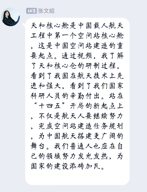 支部成员张文昭同志观看相关新闻后说道:“天和核心舱是中国载人航天工程中第一个空间站核心舱,这是中国空间站建造的重要起点。通过视频,我了解了天和核心舱的研制过程,看到了国在航天技术上的先进和强大,看到了们国家科研人员的辛勤付出。站在“十四五”开局的新起点上, 不仅是航天人要继续努力,完成空间站建造任务规划,为中国航天搭建更广阔的舞台,我们普通人也应在自己的领域努力发光发热,为国家的建设添砖加瓦。”