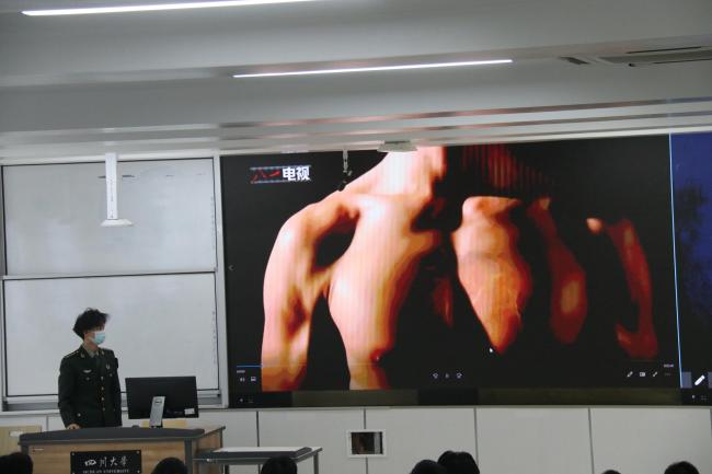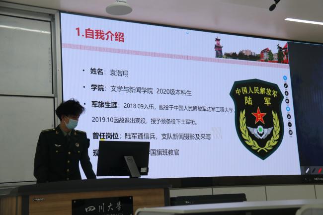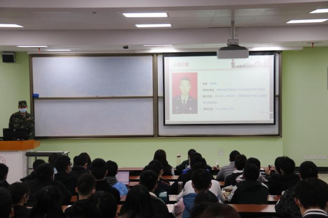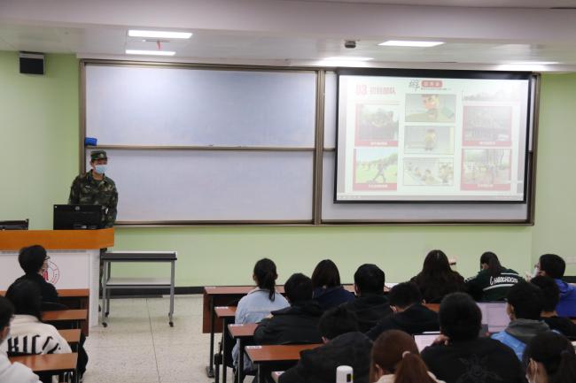 会议中,2020级文学与新闻传播专业学生袁浩翔和2019级材料科学与工程 专业学生刘恭增身着军装,进行了征兵工作的宣讲。在完成自我介绍后,两位同学首先谈及其参军经历和自我感受,向同学们讲述了他们在军队中的日常训练以及执行的任务。随后,他们以参与18XXX