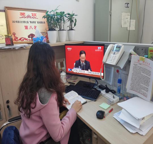 20级本科生第一党支部迅速掀起学习热潮,并在支部书记陈晓娟老师和20级辅导员朱婧老师的带领下,组织支部党员和入党积极分子准时观看党的十九届六中全会新闻发布会。同时,为响应成都市疫情防控的要求,支部决定以小组形式分散观看。