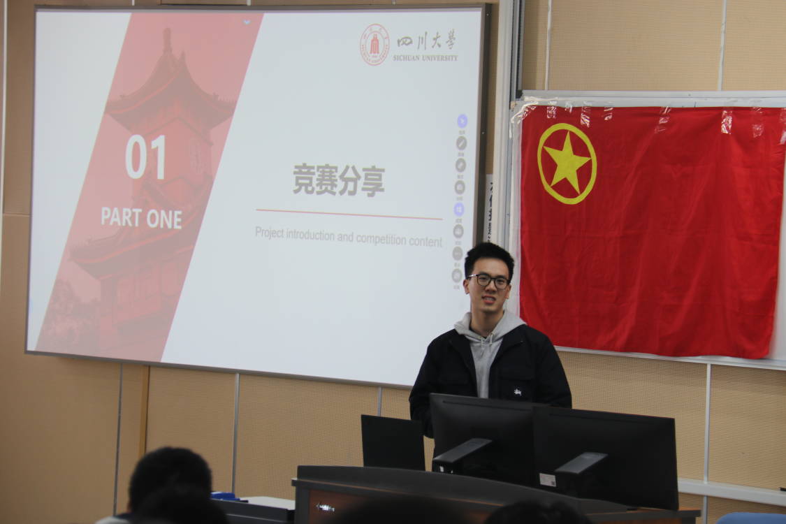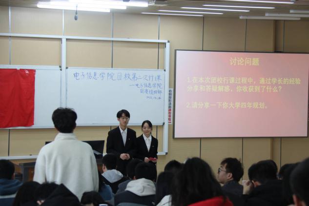 本次行课于10点15分准时开始,由李云天、陈洁同学担任主持人。首先是全体同学奏唱中国共产主义青年团团歌。随后,2018级黄奕翔同学进行了竞赛、保研、出国的经验分享。黄奕翔系18级团委学生会副主席兼“腾飞”青年志愿服务队队长,现已保研至东南大学毫米波国家重点实验室。他就自己的学习、竞赛和保研经历对同学们进行了具体的经验分享。黄奕翔语言幽默风趣,生动形象,在场的同学对竞赛和保研都有了进一步的了解。