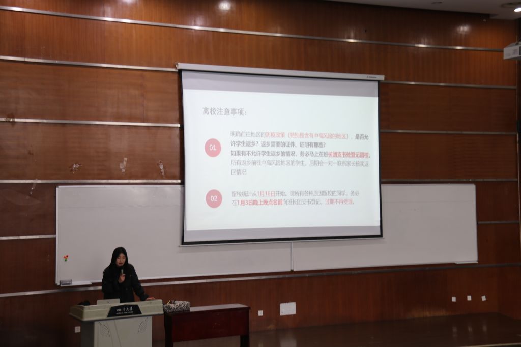 张老师指出,寒假时间为1月16号至2月16号,在疫情防控渐趋常态化的今天,同学们要遵守离校注意事项,准备回家的同学要明确前往地区的防疫政策,注意旅途安全,做好个人防护,在家也要严格遵守防疫政策;而留校的同学需要向班长团支书登记,寒假期间只有报备登记的同学才能进出寝室。最后张老师强调,返校时间应该统一,不要提前返校,若返校前所在地被列为中高风险地区,要及时联系辅导员登记。