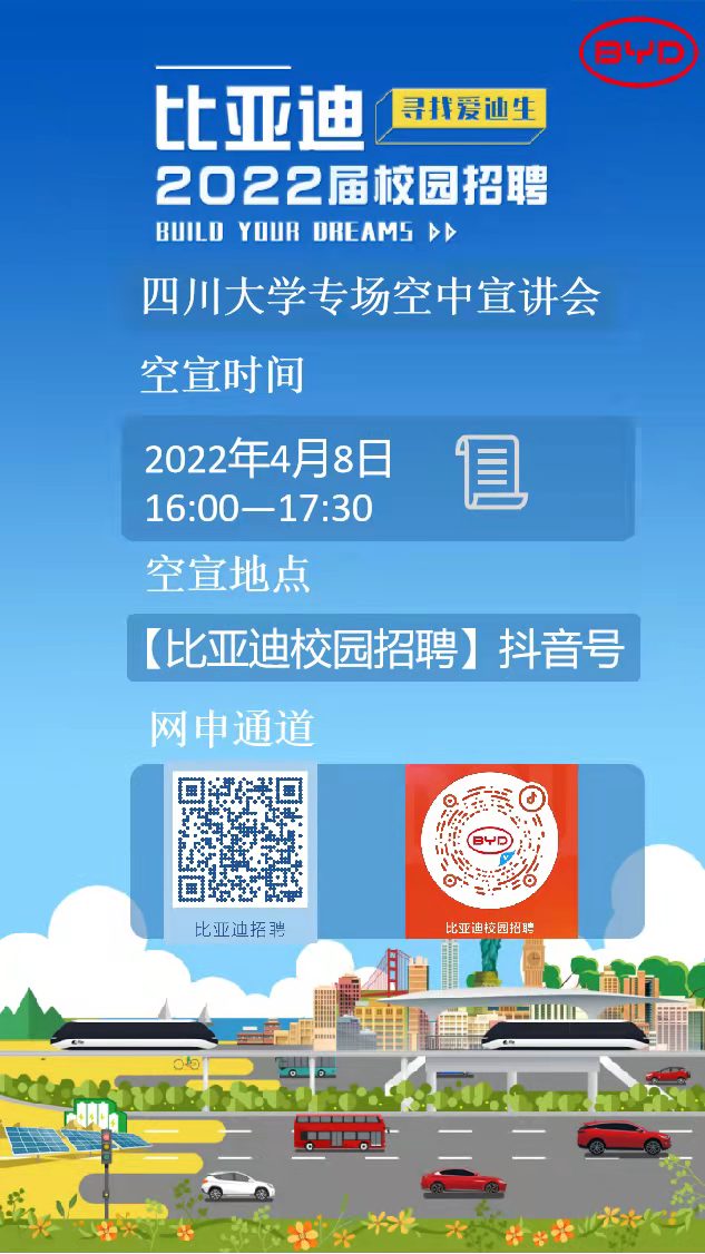 【比亚迪股份有限公司】2022春招线上宣讲会正式启动啦!学校:18XXX 时间:2022/4/816:00-20:00宣讲形式:抖音关注“比亚迪校园招聘”简历投递方式:关注“比亚迪招聘”公众号 选择菜单-校园招聘-简历投递简历投递邮箱:[email protected]联系电话:18846770194工作地点:全国城市任选欢迎各位呼朋唤友来参加哈